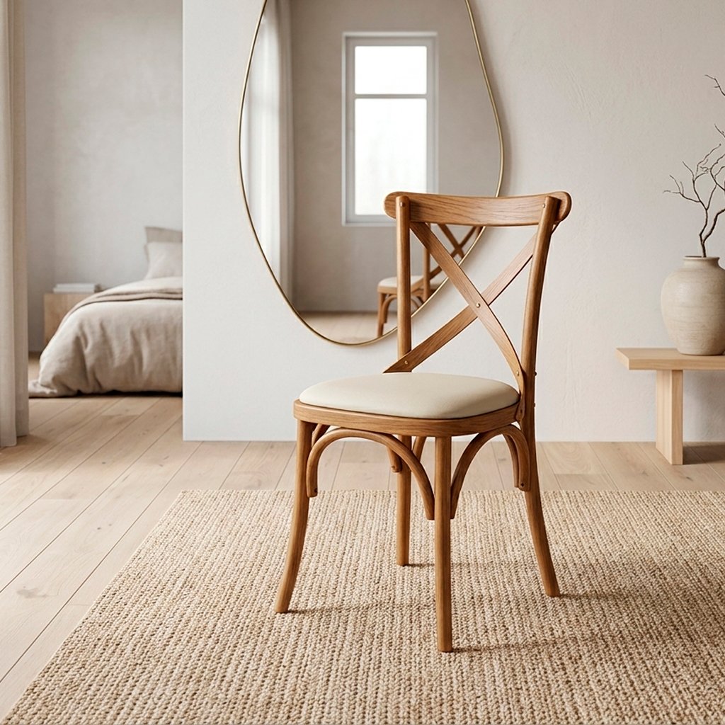 Seu icônico encosto em "X" não é apenas um detalhe visual, mas um elemento que oferece suporte ergonômico e estabilidade. O assento estofado, disponível em acabamentos premium como Facto Dunas e Corano, proporciona o conforto ideal para longos jantares em família. Projetada para resistir, a Cadeira Xis suporta até 150kg, unindo a leveza estética com a força bruta da madeira natural.