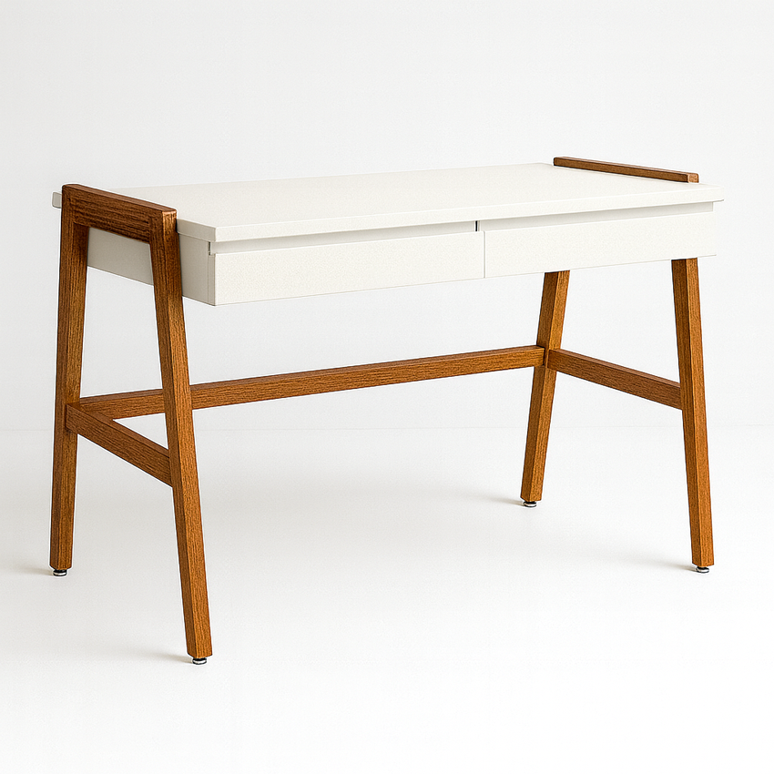 1. A Harmonia dos Materiais (Madeira + Cor): O nome "Dua" celebra a dualidade dos acabamentos. A estrutura robusta com pés em madeira maciça garante durabilidade e estabilidade, enquanto o tampo com acabamento impecável (disponível em 5 cores) traz modernidade. Essa combinação cria uma estética clean e acolhedora, ideal para manter o foco e a criatividade.